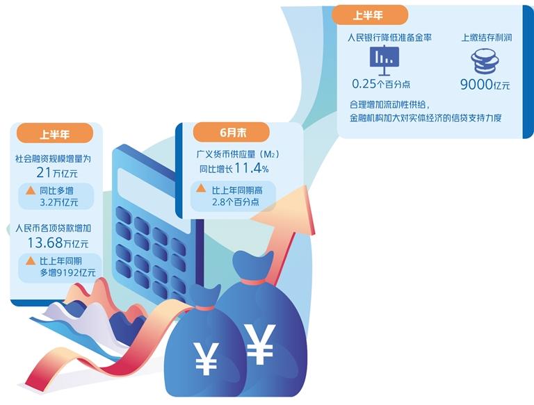 上半年,一系列政策加快落地,加大对实体经济的支持力度。人民银行降低准备金率0.25个百分点,上缴结存利润9000亿元,合理增加流动性供给,金融机构加大对实体经济的信贷支持力度。6月末,广义货币供应量(M_2)同比增长11.4%,比上年同期高2.8个百分点;上半年,社会融资规模增量为21万亿元,同比多增3.2万亿元,人民币各项贷款增加13.68万亿元,比上年同期多增9192亿元。