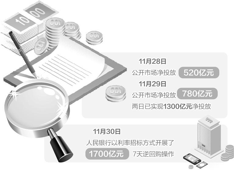近日,中国人民银行逆回购操作力度逐渐加大,由上周的净回笼转变为本周的净投放。11月30日,人民银行以利率招标方式开展了1700亿元7天逆回购操作。29日,人民银行开展了800亿元逆回购操作,公开市场实现净投放780亿元,加上28日净投放的520亿元,两日已实现1300亿元净投放。