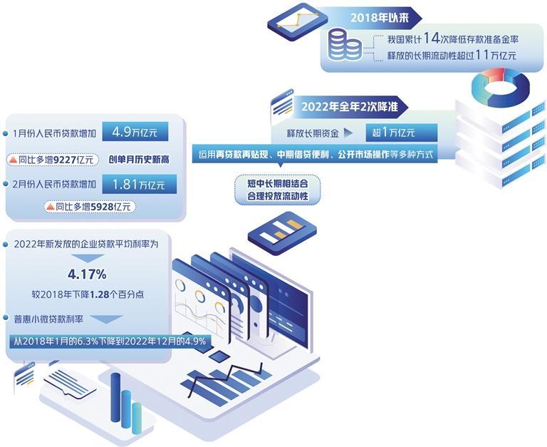 从总量上看,一方面,保持流动性合理充裕。2018年以来,我国累计14次降低存款准备金率,释放的长期流动性超过11万亿元。2022年全年两次降准,释放长期资金超1万亿元,运用再贷款再贴现、中期借贷便利、公开市场操作等多种方式,短中长期相结合,合理投放流动性。