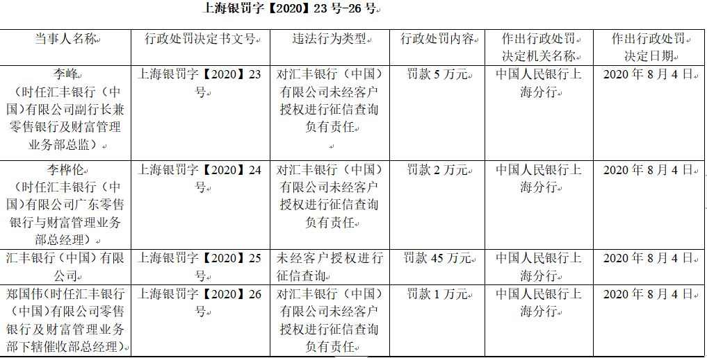上海分行行政处罚信息公示表(上海银罚字【2020】24号)显示,时任汇丰银行广东零售银行与财富管理业务部总经理李桦伦对汇丰银行未经客户授权进行征信查询负有责任,被中国人民银行上海分行处以罚款2万元。