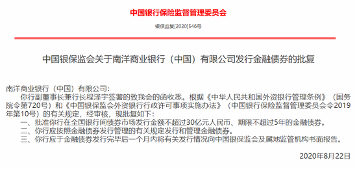 南洋商业银行(中国)获准发行不超过30亿元金融债券 日期: 2026-03-04 06:10 栏目:金融要闻 浏览: 8月28日消息,银保监会发布关于南洋商业银行(中国)有限公司发行金融债券的批复。批复显示,银保监会批准南洋商业银行(中国)在全国银行间债券市场发行金额不超过30亿元人民币、期限不超过5年的金融债券。 以下为批复原文: 标签: 上一篇:鲁洪均韩亚银行(中国)首席财务官任职资格获批 下一篇:东亚银行遭多家大行发研报看淡 相关推荐 东亚中国积极参与 2020 年中国国际服务贸易交易会 鲁洪均韩亚银行(中国)首席财务官任职资格获批 东亚银行遭多家大行发研报看淡 东亚银行上半年实现净利润15.32亿元 增长53%