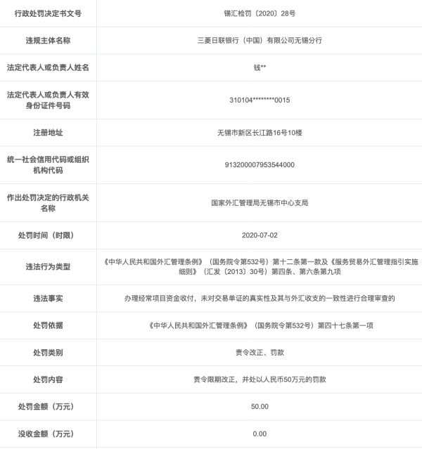 中国经济网北京6月29日讯 近日,国家外汇管理局网站公布的行政处罚决定书(锡汇检罚〔2020〕28号)显示,三菱日联银行(中国)有限公司无锡分行办理经常项目资金收付时,未对交易单证的真实性及其与外汇收支的一致性进行合理审查。依据《中华人民共和国外汇管理条例》(国务院令第532号)第四十七条第一项,国家外汇管理局无锡市中心支局给予其责令限期改正,并处以人民币50万元的罚款。