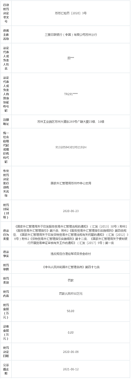 中国经济网北京6月12日讯 国家外汇管理局江苏省分局今日公布的行政处罚信息公示表(苏苏汇检罚〔2020〕3号)显示,三菱日联银行(中国)有限公司苏州分行(以下简称:“三菱日联银行苏州分行”)违反规定办理经常项目资金收付。