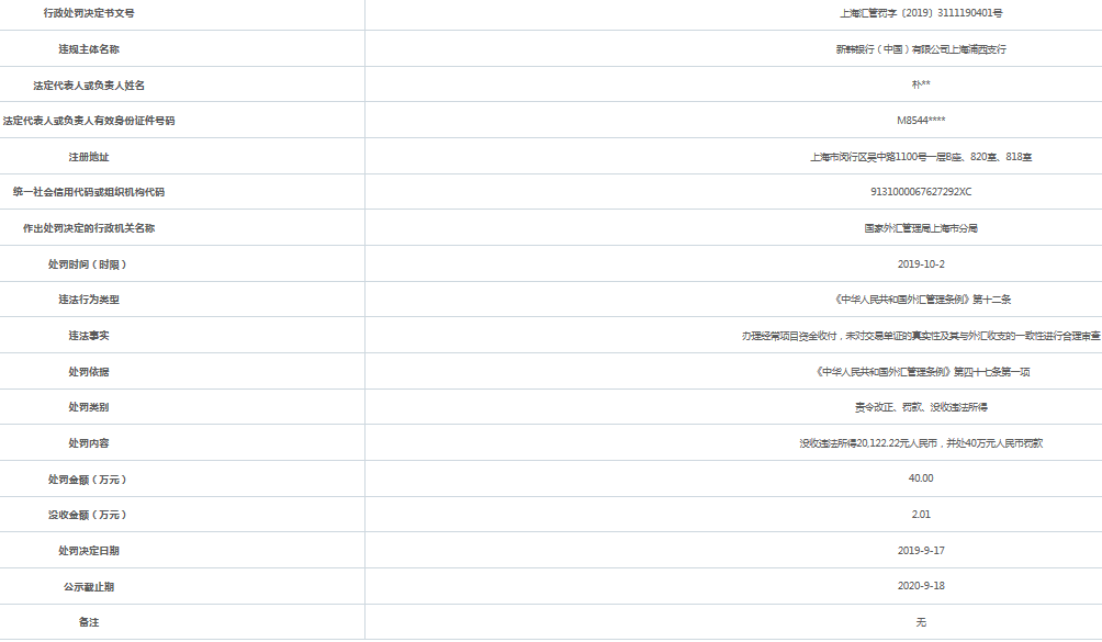 2019年9月17日,国家外汇管理局上海市分局依据《中华人民共和国外汇管理条例》第四十七条第一项作出处罚决定,对新韩银行(中国)有限公司上海浦西支行没收违法所得20,122.22元人民币,并处40万元人民币罚款。