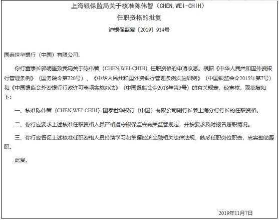 批复显示,上海银保监局根据有关规定,核准施懿娟(SHIH,YI-CHUAN)国泰世华银行(中国)副行长的任职资格,核准陈伟智(CHEN,WEI-CHIH)国泰世华银行(中国)副行长兼上海分行行长的任职资格。