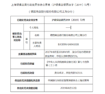 德国商业银行上海分行被罚50万:存在以贷收费的行为 日期: 2026-04-08 06:10 栏目:金融要闻 浏览: 中国金融网8月21日讯 上海银保监局近日公布关于德国商业银行股份有限公司上海分行的行政处罚信息公开表。德国商业银行股份有限公司上海分行因存在以贷收费的行为,被上海银保监局罚款人民币50万元。 以下为行政处罚信息公开表: 标签: 上一篇:汇丰完成全球首笔区块链跨境人民币信用证业务 下一篇:恒生银行(中国)首席财务官、董秘获批 相关推荐 台湾金融机构直接持股厦门银行 东亚中国发布《2018企业社会责任报告》 花旗中国副行长袁俊:为“一带一路”提供高质量金融服务 星展第一季度利润意外增长9%